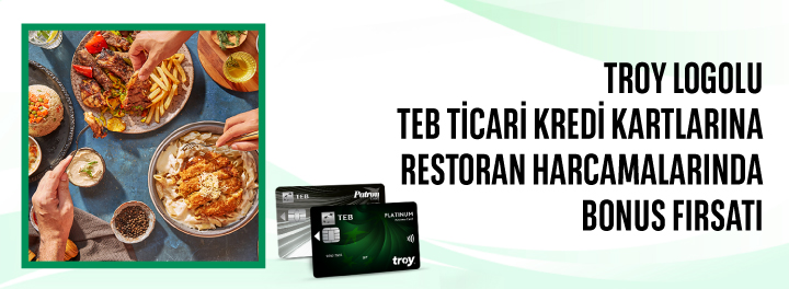 - Kampanyaya katılarak TEB TROY Logolu Ticari Kredi Kartlarınız ile 1-31 Aralık 2025 tarihleri arasında tek seferde yapacağınız 2.500 TL ve üzeri restoran harcamalarınıza 250 TL, toplam 500 TL Bonus kazanabilirsiniz.