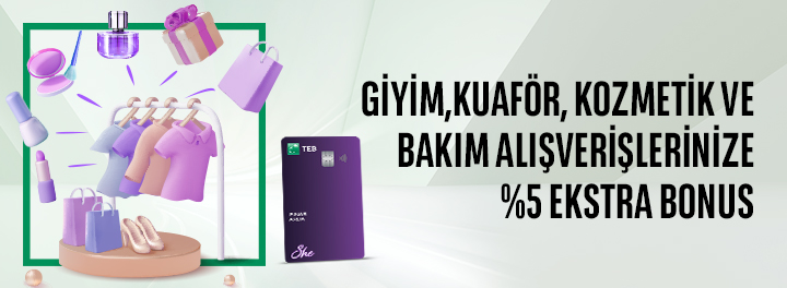 She Card’ınız ile tek seferde yapacağınız 1.500 TL ve üzeri tüm giyim, kuaför, kozmetik ve bakım alışverişlerinize %5 Ekstra Bonus kazanma fırsatı sizi bekliyor.
