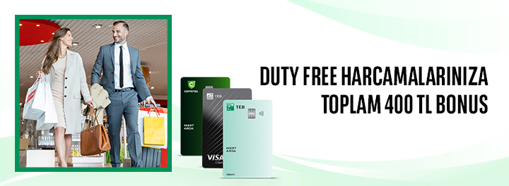 - Kampanyaya katılarak TEB Bireysel Kredi Kartlarınız ile 1- 31 Aralık 2025 tarihleri arasında yurt içi ve yurt dışı duty free alışverişlerinizde tek seferde 2.500 TL ve üzeri harcamaya 200 TL bonus, toplam 400 TL bonus kazanabilirsiniz.