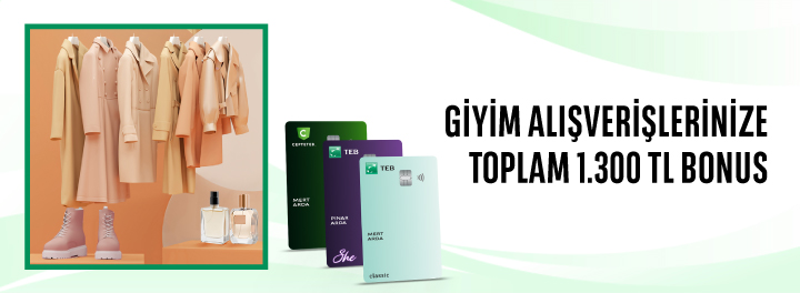 Kampanyaya katılarak TEB Visa ve Mastercard Logolu Bireysel Kredi Kartlarınız ile 1-30 Kasım 2025 tarihleri arasında bonus üyesi giyim, aksesuar, kozmetik ve ayakkabı alışverişlerinde tek seferde 2.500 TL ve üzeri her harcamaya 130 TL, toplam 1.300 TL Bonus kazanabilirsiniz.