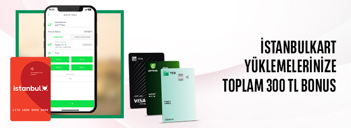 - Kampanyaya katılarak TEB Bireysel Kredi Kartlarınız ile 1 Ekim-31 Aralık 2025 tarihleri arasında CEPTETEB Mobil üzerinden yapacağınız 350 TL ve üzeri İstanbulkart yüklemesine ayda en fazla 100 TL, 31 Aralık’a kadar toplamda 300 TL Bonus kazanabilirsiniz.