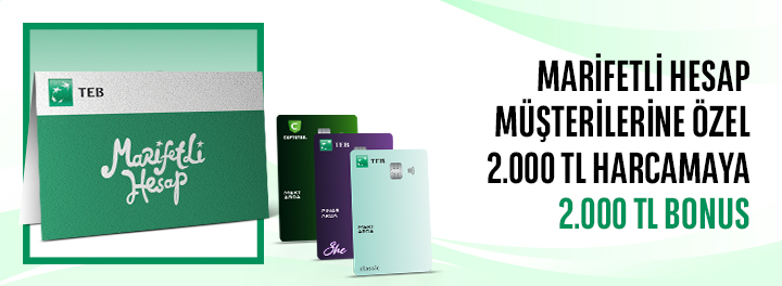 01 Kasım 2025 itibarıyla ilk kez TL Marifetli Hesap veya CEPTETEB Marifetli TL Hesap açan ve TEB Bireysel Kredi Kartı olmayan müşteriler, Kredi kartı başvuruları onaylandıktan sonra TEB Bireysel Kredi Kartı ile 31 Aralık 2025 tarihine kadar gerçekleştirecekleri toplam 2.000-TL ve üzeri harcamaya 2.000-TL Bonus kampanyasından faydalanabilecektir.