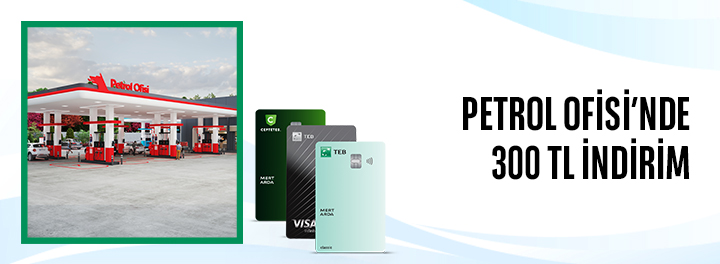 - Kampanyaya katılarak TEB Bireysel Kredi Kartlarınız ile 1 Ekim- 15 Kasım 2025 tarihleri arasında Bonus üyesi Petrol Ofisi İstasyonlarında ayrı günlerde ve tek seferde, 4 defa 900 TL ve üzeri akaryakıt ya da otogaz harcaması yapın; SMS ile kampanyaya katılarak 250 TL İNDİRİM, CEPTETEB Mobil üzerinden kampanyaya katılarak 300 TL İNDİRİM kazanın.