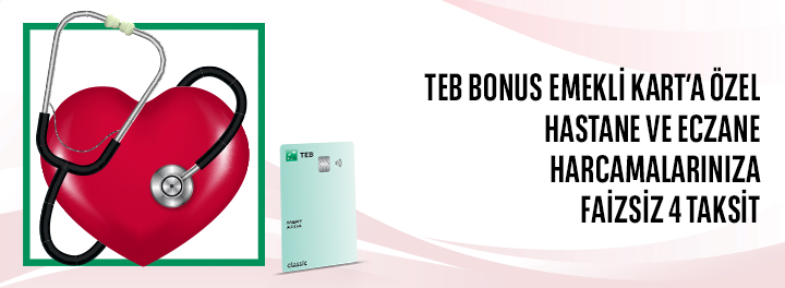 - TEB Bonus Emekli Kredi Kartınız ile 1 Aralık 2025-28 Şubat 2026 tarihleri arasında tek seferde 1.000 TL - 500.000 TL tutarları arasında yapacağınız peşin hastane ve eczane harcamalarınıza faizsiz 4 taksit sunulacaktır.