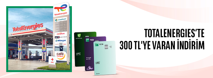 - Kampanyaya katılarak TEB Bireysel Kredi Kartlarınız ile 16 Kasım-31 Aralık 2025 tarihleri arasında seçili Bonus üyesi TotalEnergies İstasyonları’nda ayrı günlerde ve tek seferde, 4 defa 1.000 TL ve üzeri akaryakıt ya da otogaz harcaması yapın; SMS ile kampanyaya katılarak 250 TL İNDİRİM, CEPTETEB Mobil üzerinden kampanyaya katılarak 300 TL İNDİRİM kazanın.