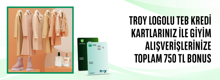 - Kampanyaya katılarak TEB TROY Logolu Bireysel Kredi Kartlarınız ile 1-31 Aralık 2025 tarihleri arasında tek seferde yapacağınız 2.000 TL ve üzeri giyim, aksesuar, kozmetik ve ayakkabı harcamalarınıza 150 TL, toplam 750 TL Bonus kazanabilirsiniz.