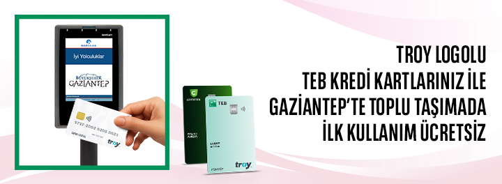 TEB TROY Logolu Kredi Kartlarınız ile Gaziantep’te Pazartesi Günleri Toplu Taşıma’da Temassız Yapacağınız İlk Ulaşım Ücretsiz!