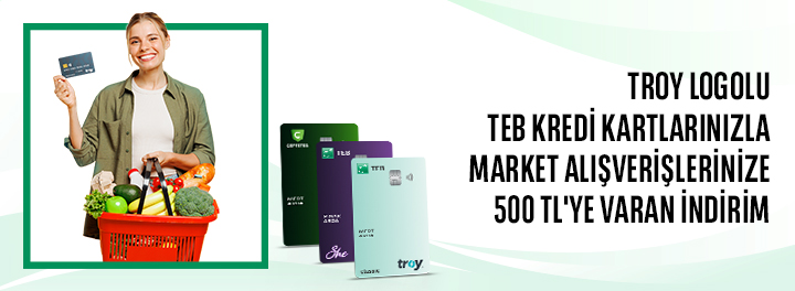 TEB Bireysel TROY Logolu Kredi Kartlarına Özel Market Harcamalarınıza 500 TL’ye Varan İndirim!