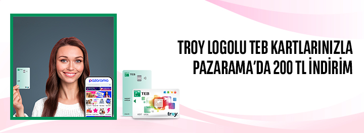 TROY Logolu TEB Kartlarınızla Pazarama’da tek seferde 1.000 TL ve üzeri alışverişe 200 TL indirim, üstelik 5.000 TL ve üzeri alışverişe 200 TL indirime ek 350 TL değerinde Yıllık Pazarama Plus Üyelik Hediye!